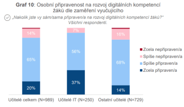 V rámci šetření byla zjišťována vnímaná připravenost na rozvoj digitálních kompetencí žáků, a to jak v obecné rovině (tedy jak je připravena škola), tak v rovině osobní (tedy jak je připraven konkrétní dotázaný učitel). Osobní připravenost nepatrně převyšuje tu obecnou, i tak se ale v obou rovinách celková připravenost šplhá přes 80 %. Obě roviny připravenosti souvisí s dobou startu výuky podle revidovaného ŠVP. To je patrné jednak z porovnání pocitu NEpřipravenosti mezi gymnázii (22,6 %) a základními školami (16,6 %), jednak z porovnání základních škol podle začátku výuky podle ŠVP (ZŠ, kde výuka na druhém stupni začala až loni, mají s 6 % výrazně větší podíl „zcela nepřipravených“). Jako osobně nejvíce připraveni se vnímají kariérně nejmladší vyučující, zajímavé je pak druhé místo těch naopak nejzkušenějších.